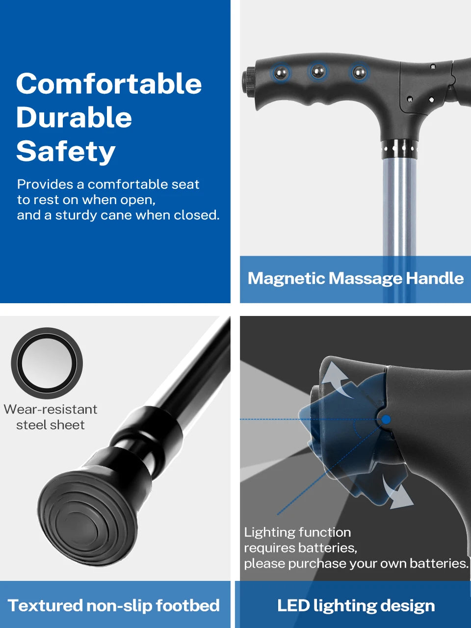 ✔Comfortable Seat and Sturdy Support: Provides a comfortable seat to rest on when open, and a sturdy support cane when closed.